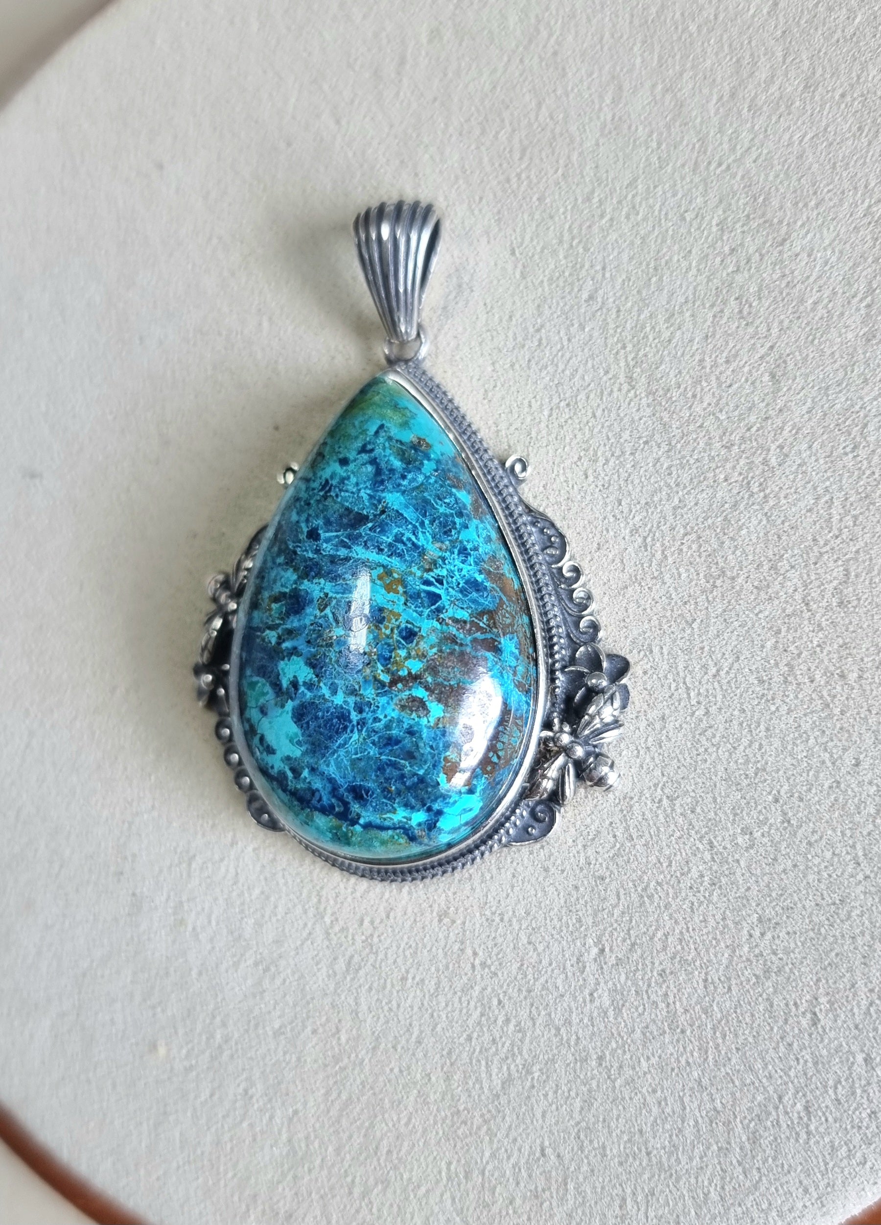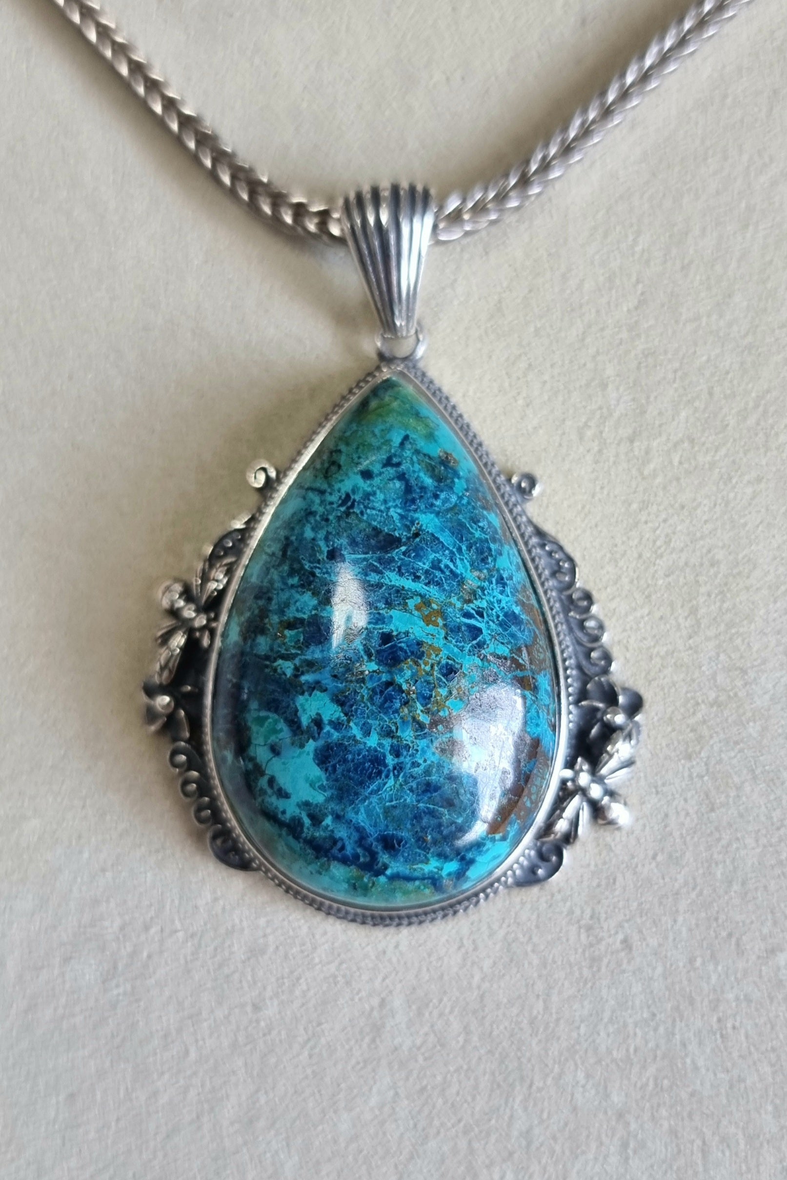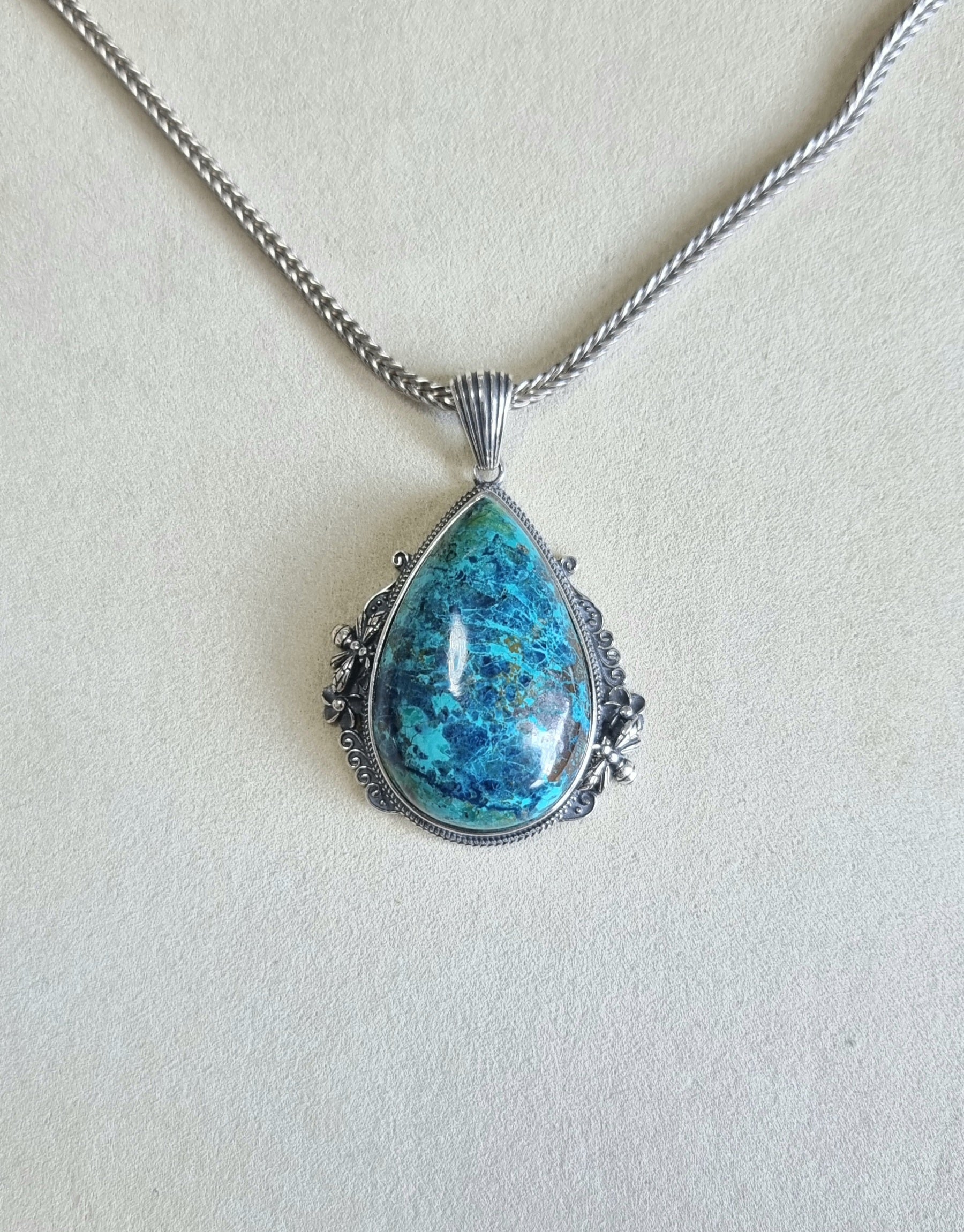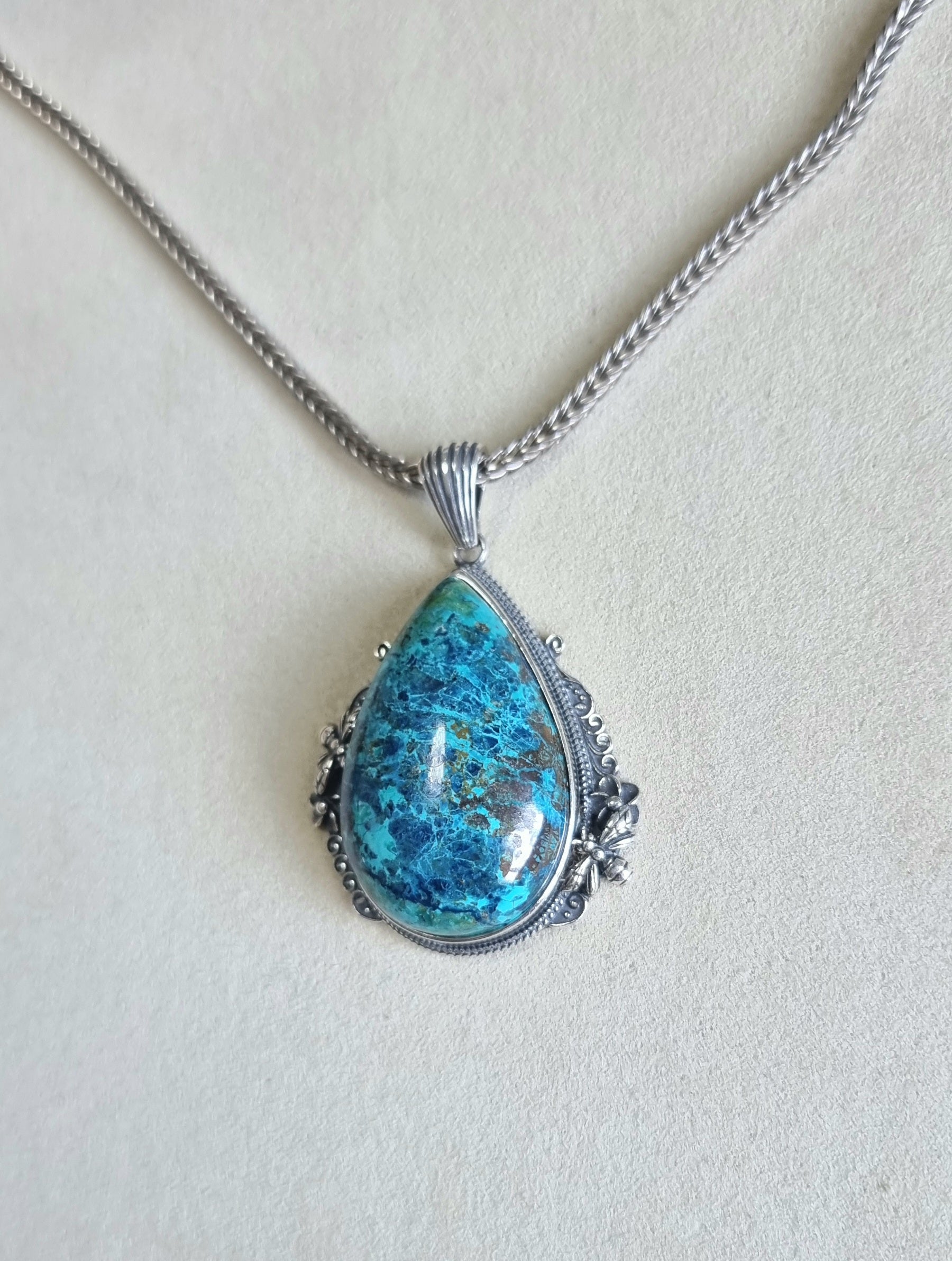 Chrysocolla Tearsdrop Pendant in S925 Tibetan Silver with Certification (High Grade)