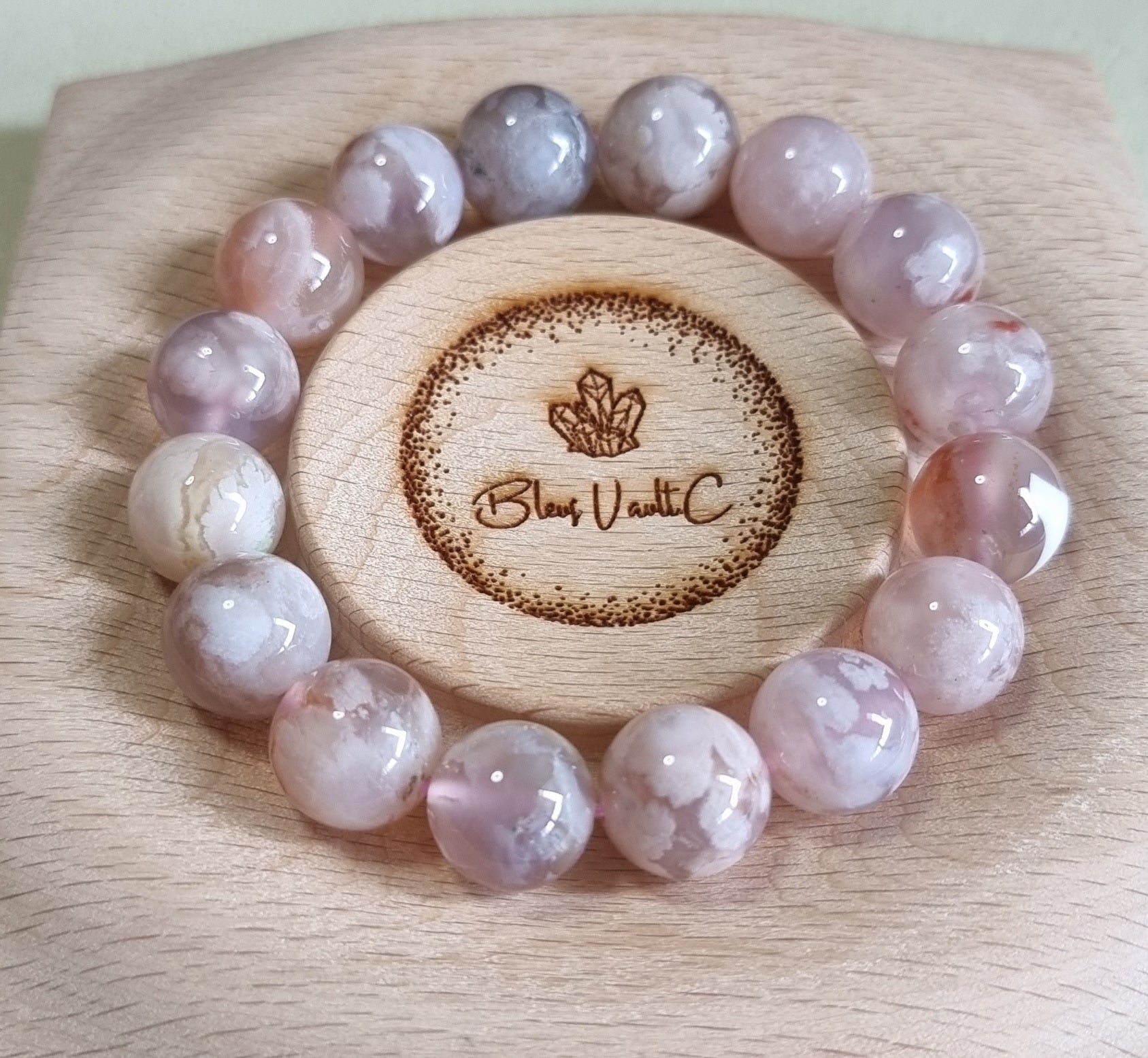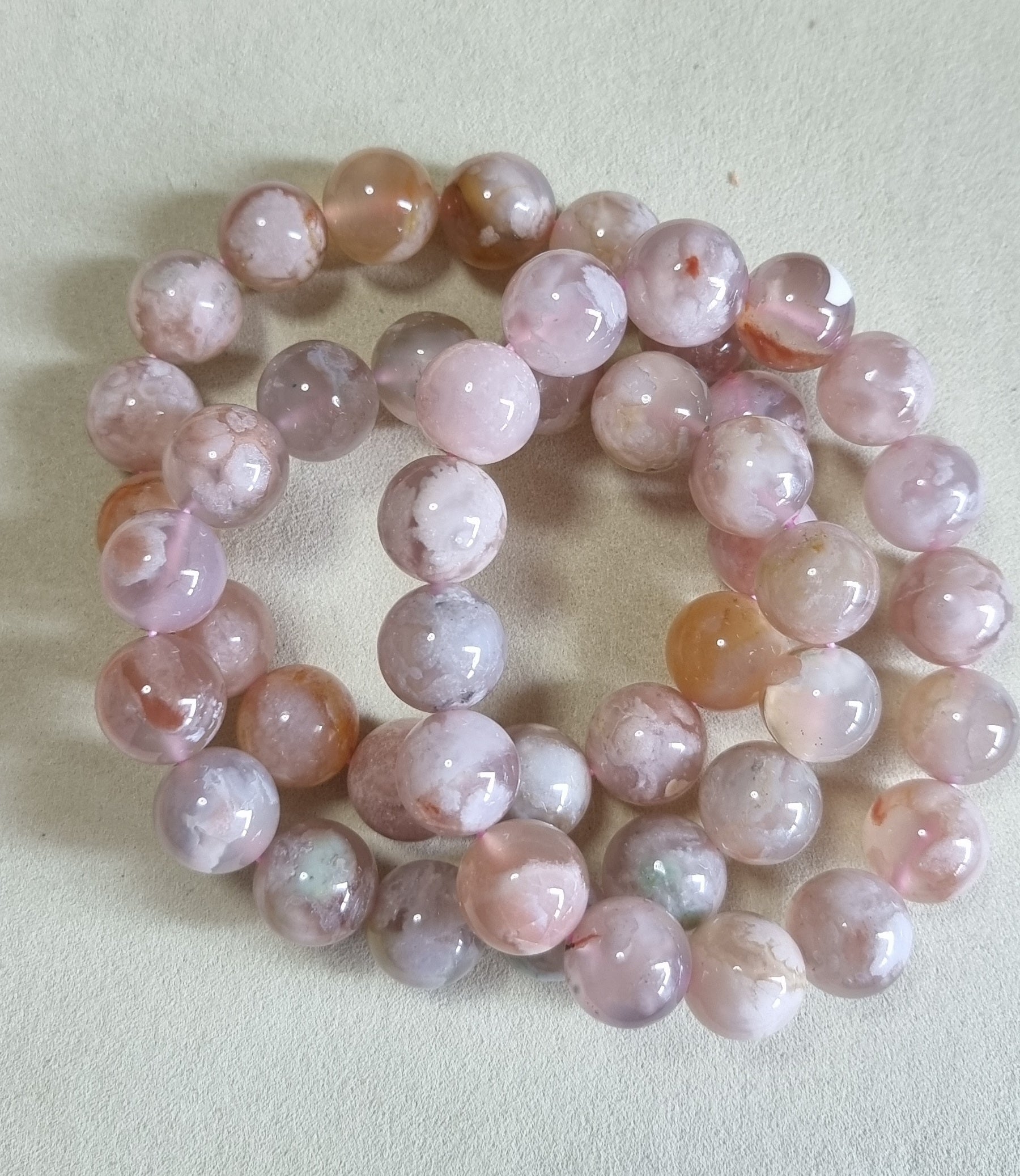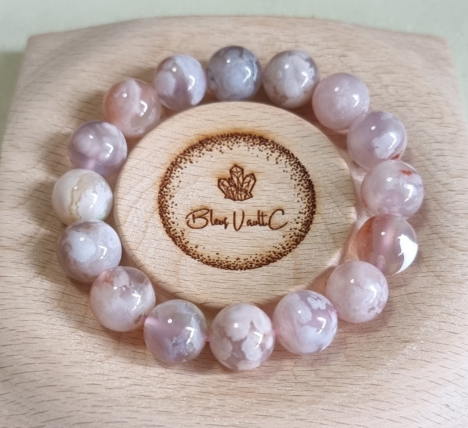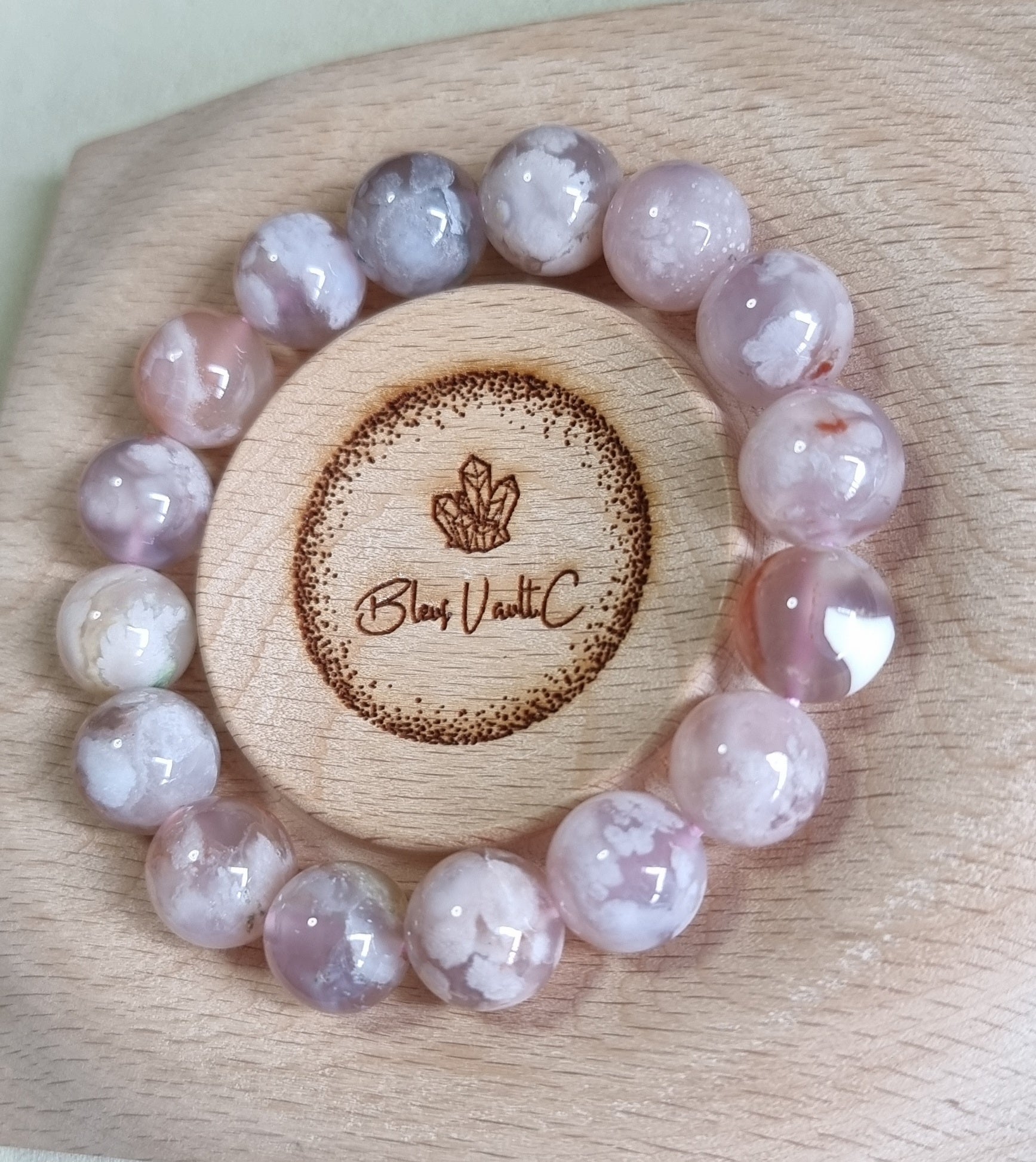 Cherry Blossom Agate has the effects of both agate and rose quartz. Agate has strong positive energy and has the functions of balance, stability and protection. On the other hand, it can calm nervousness and help improve popularity and marriage luck. It can too promote blood circulation and metabolism, relieve discomfort caused by menstrual period, and regulate female hormones. It has the effect of beautifying and improving complexion.
