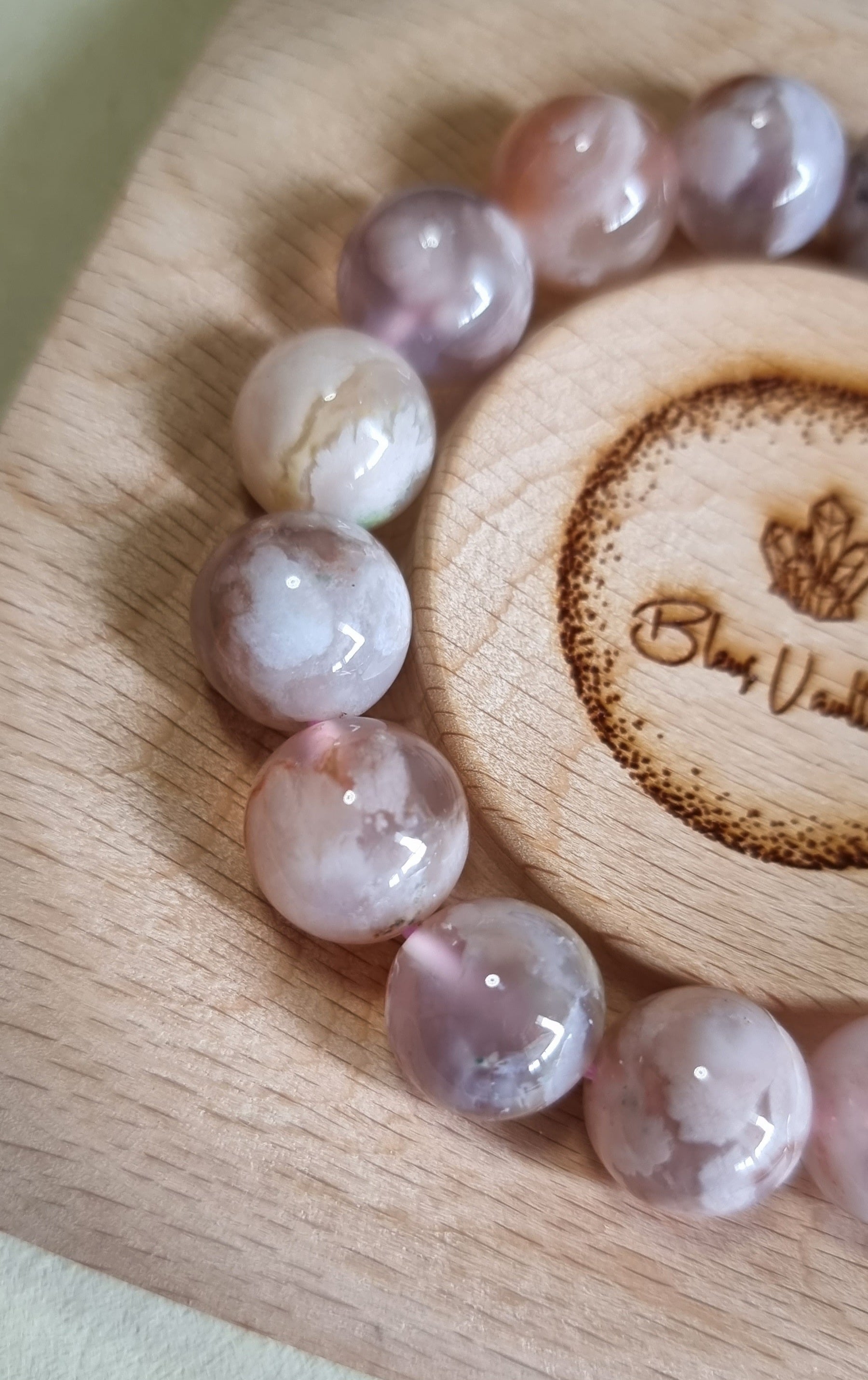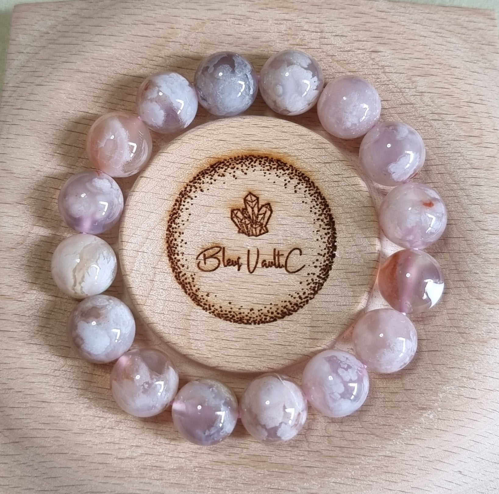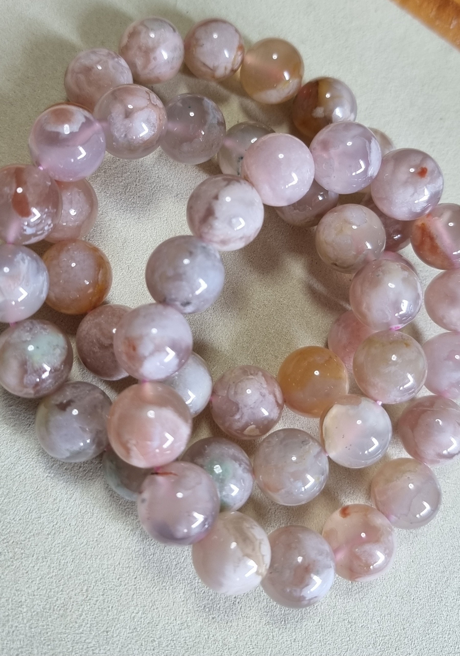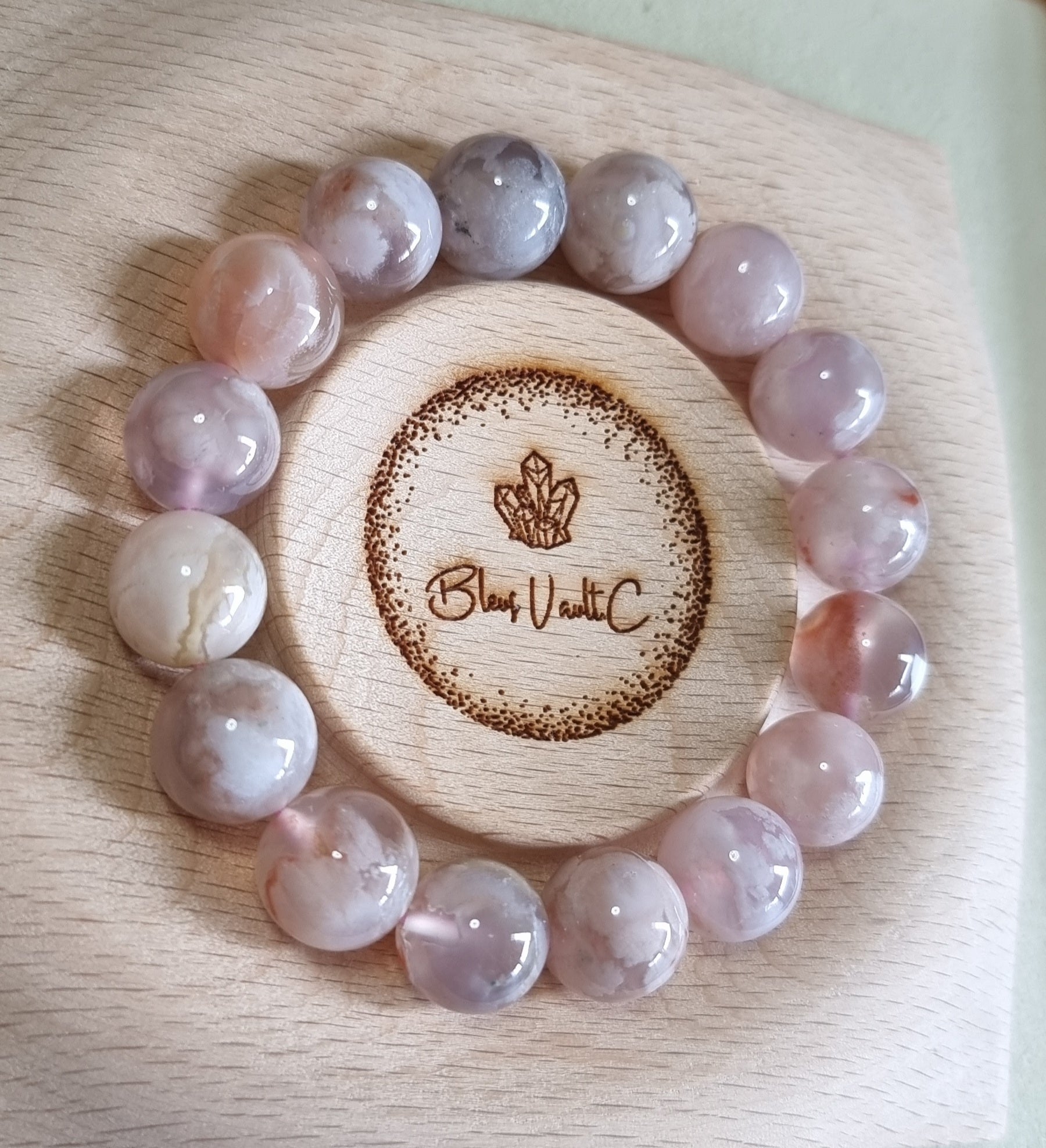 Cherry Blossom Agate has the effects of both agate and rose quartz. Agate has strong positive energy and has the functions of balance, stability and protection. On the other hand, it can calm nervousness and help improve popularity and marriage luck. It can too promote blood circulation and metabolism, relieve discomfort caused by menstrual period, and regulate female hormones. It has the effect of beautifying and improving complexion.