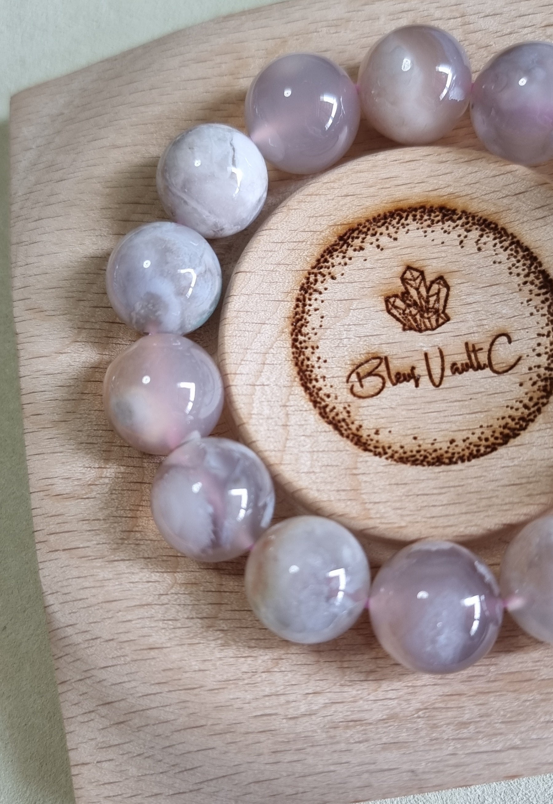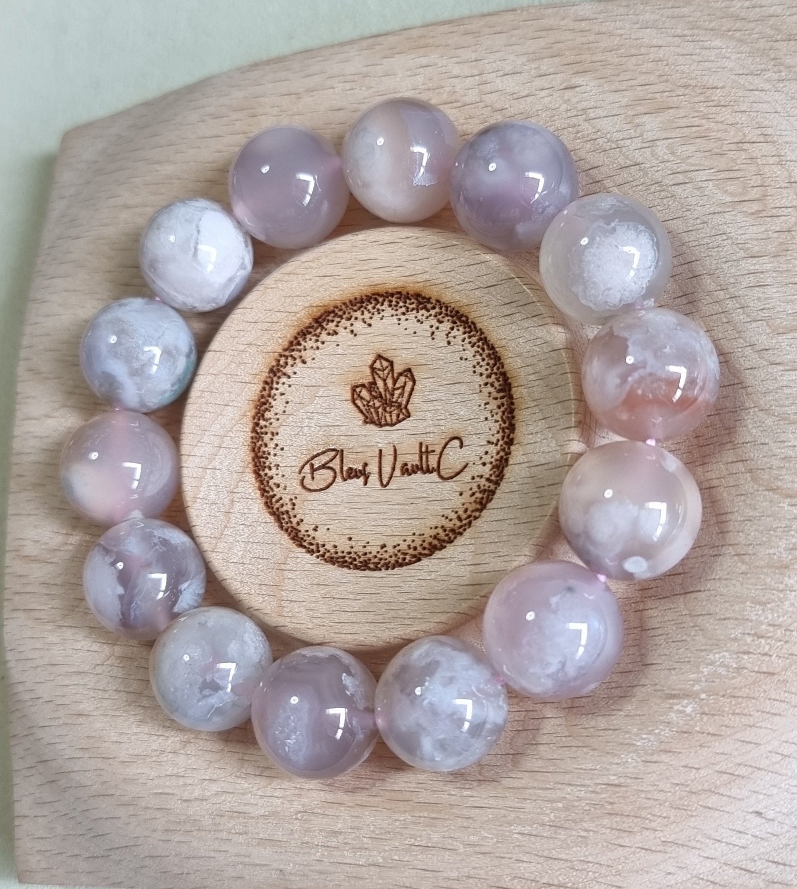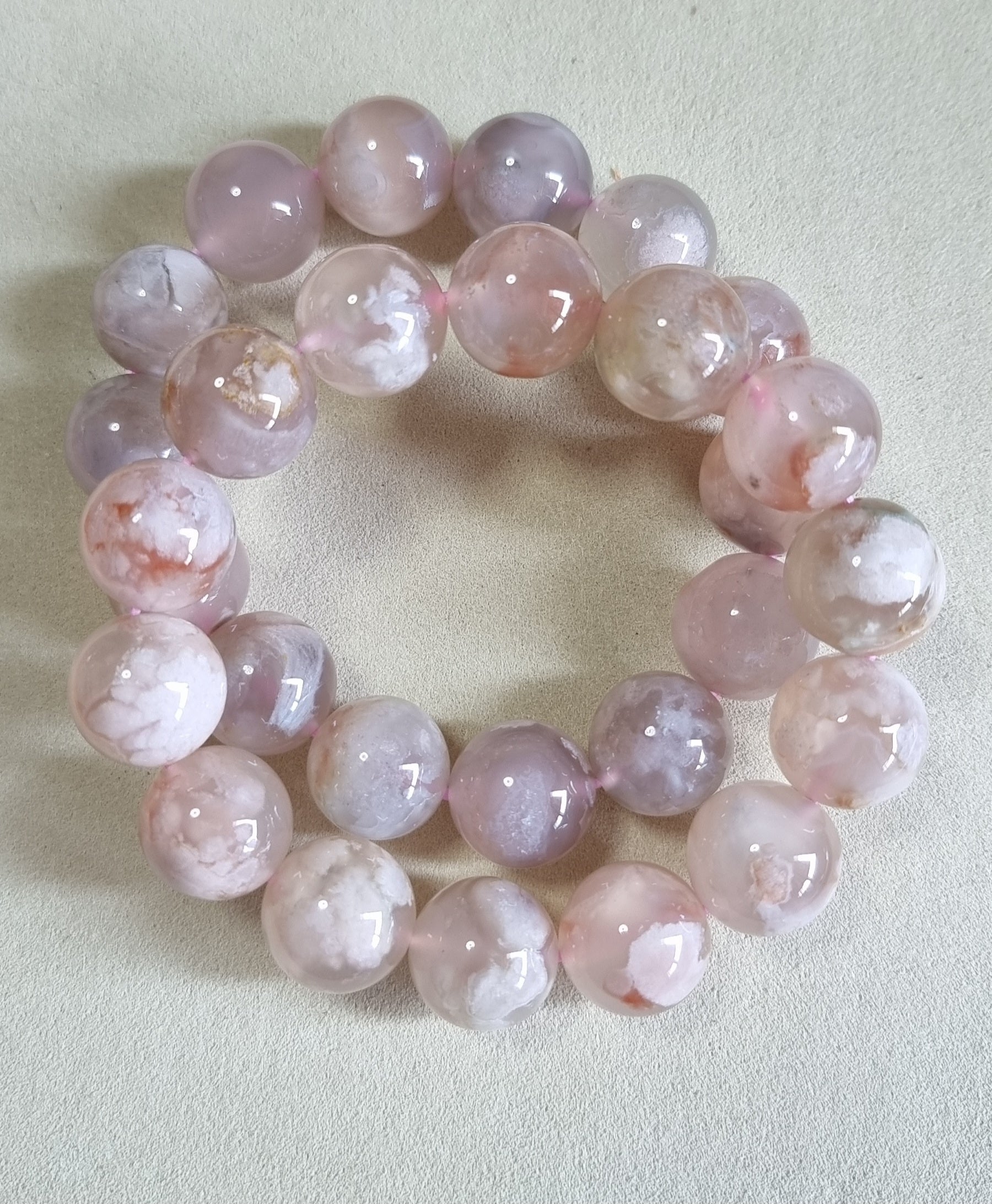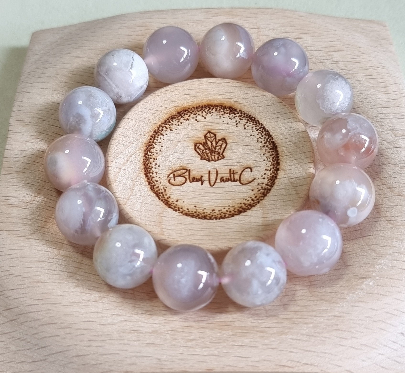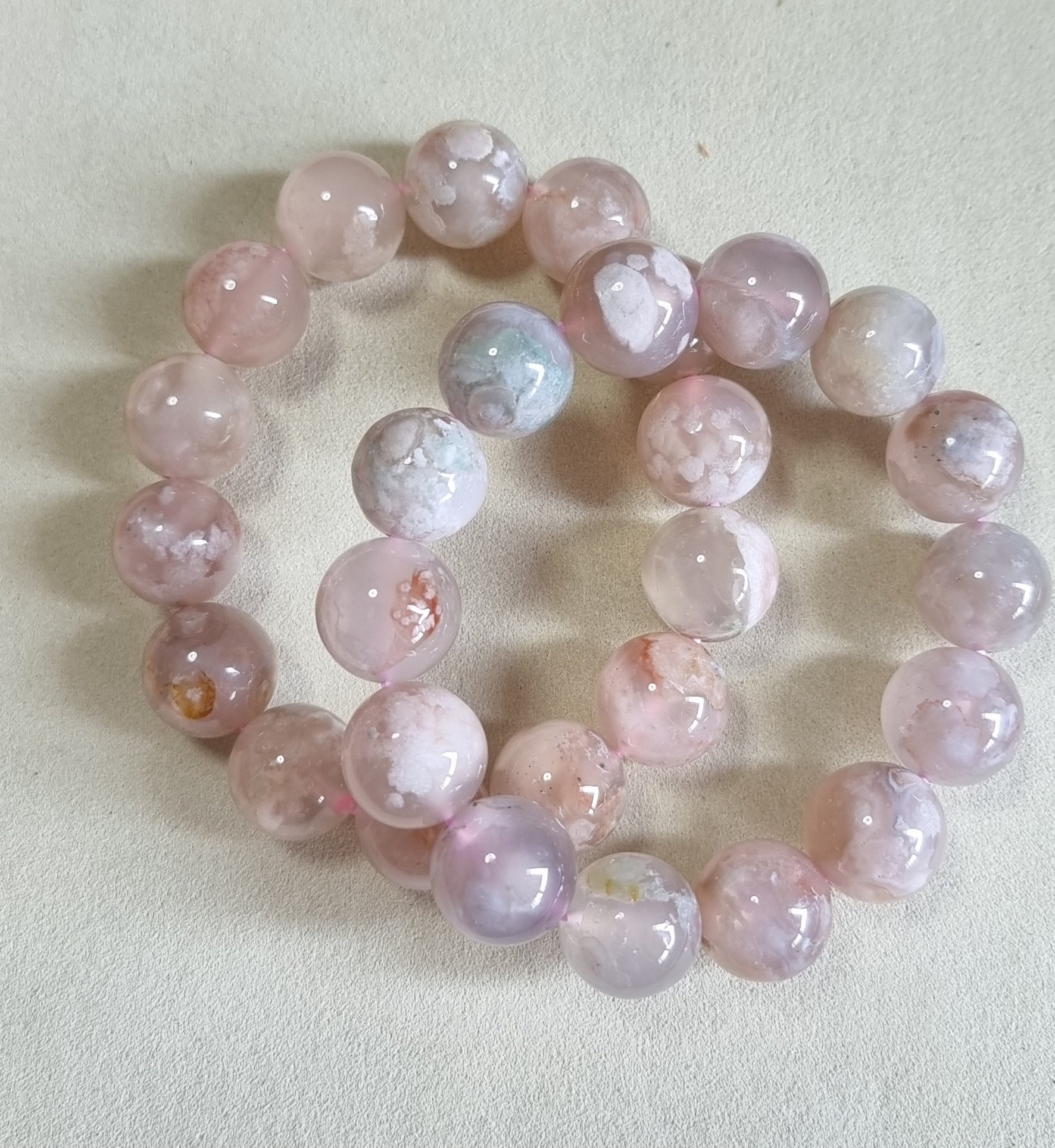 Cherry Blossom Agate has the effects of both agate and rose quartz. Agate has strong positive energy and has the functions of balance, stability and protection. On the other hand, it can calm nervousness and help improve popularity and marriage luck. It can too promote blood circulation and metabolism, relieve discomfort caused by menstrual period, and regulate female hormones. It has the effect of beautifying and improving complexion.