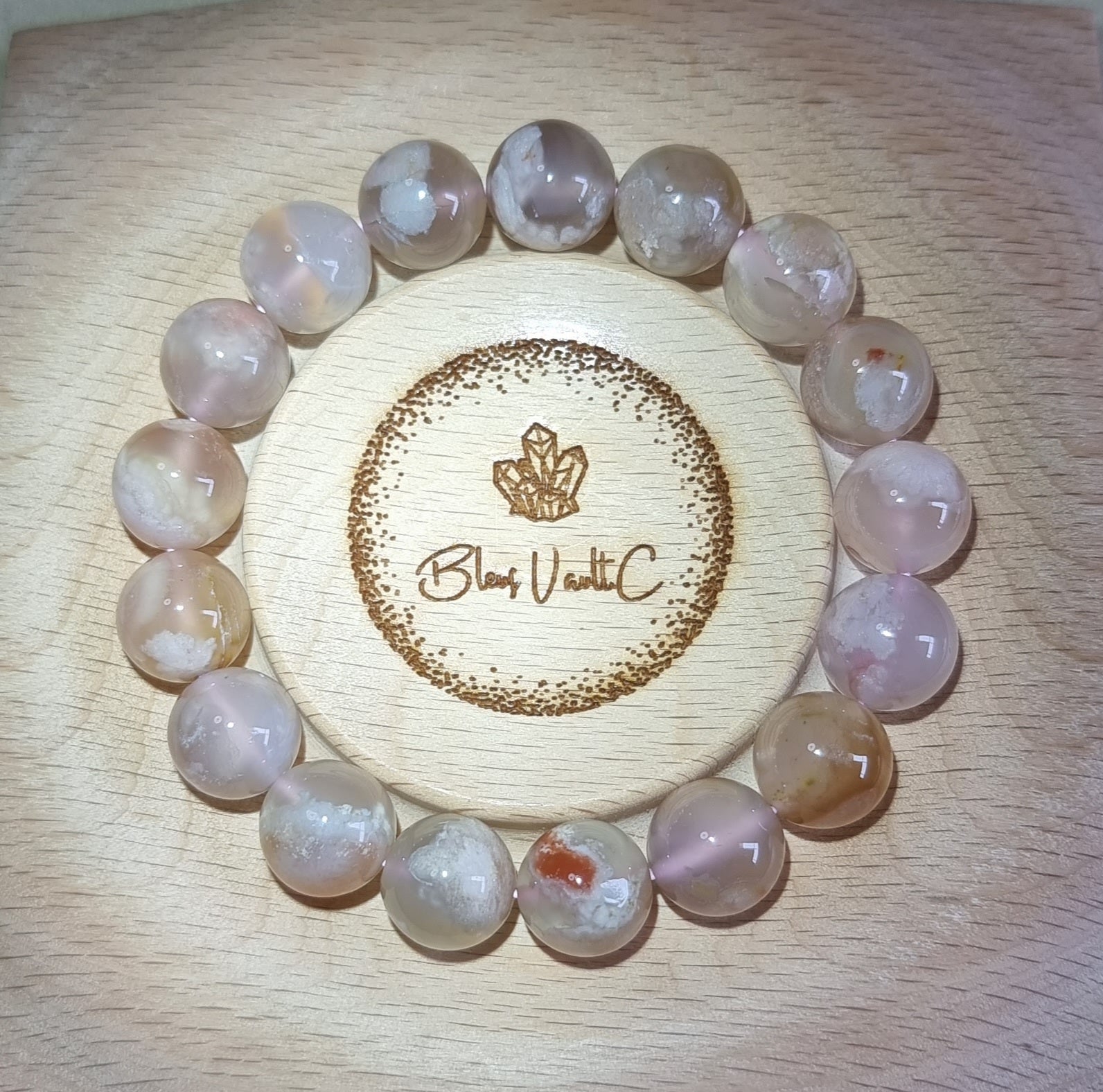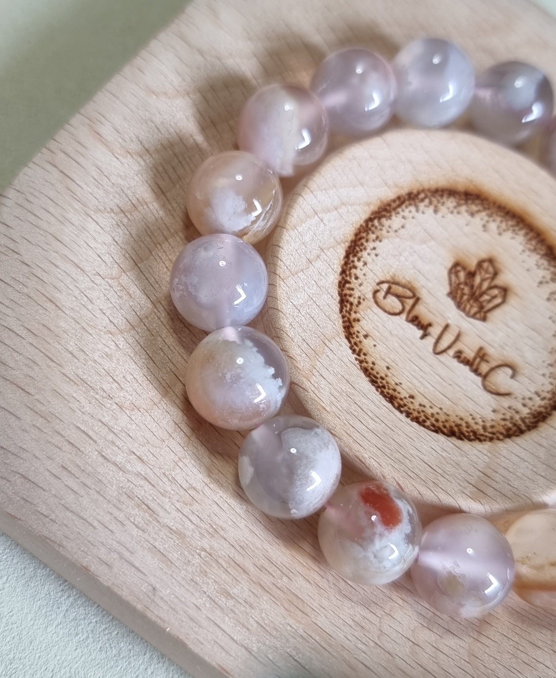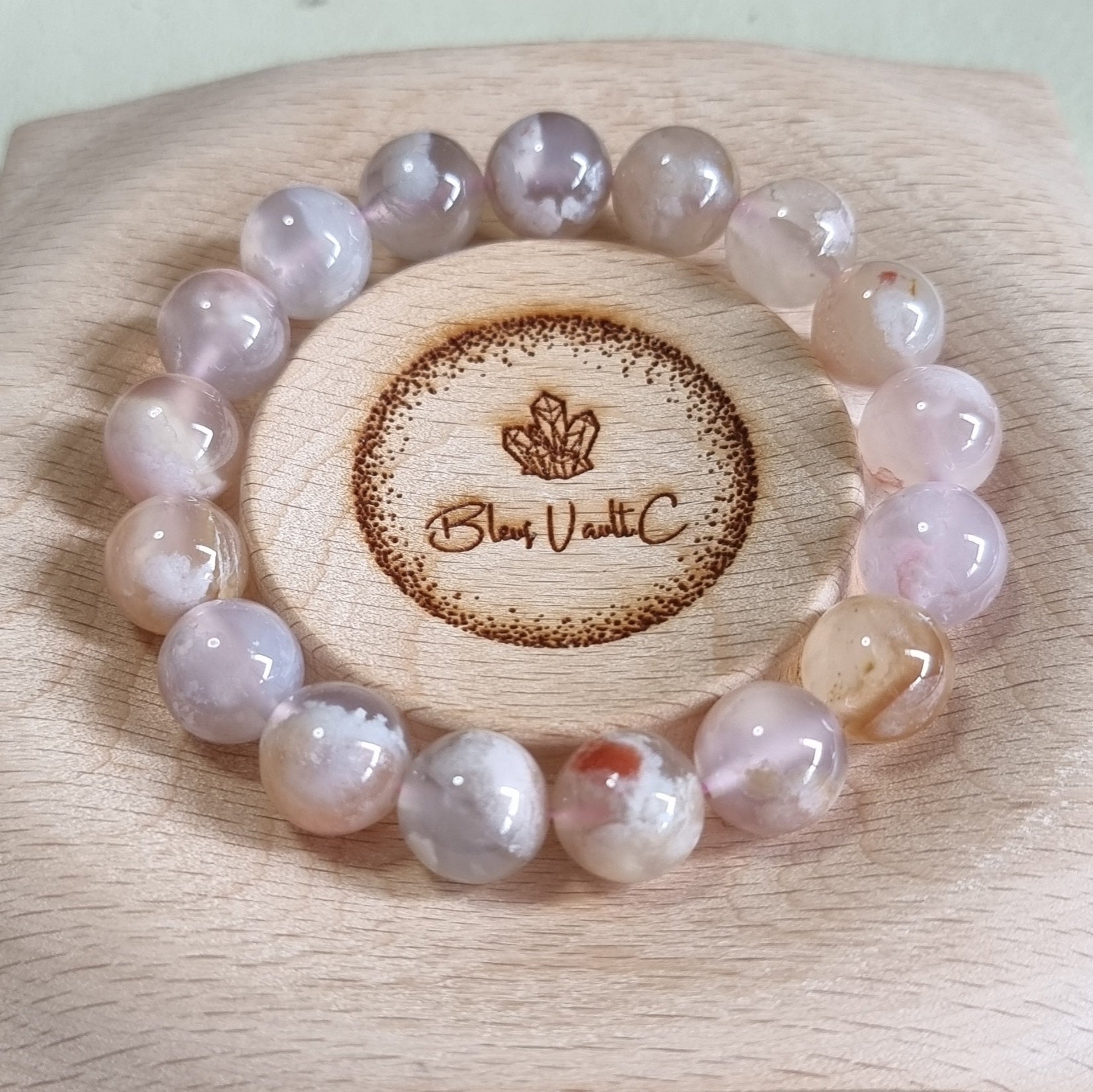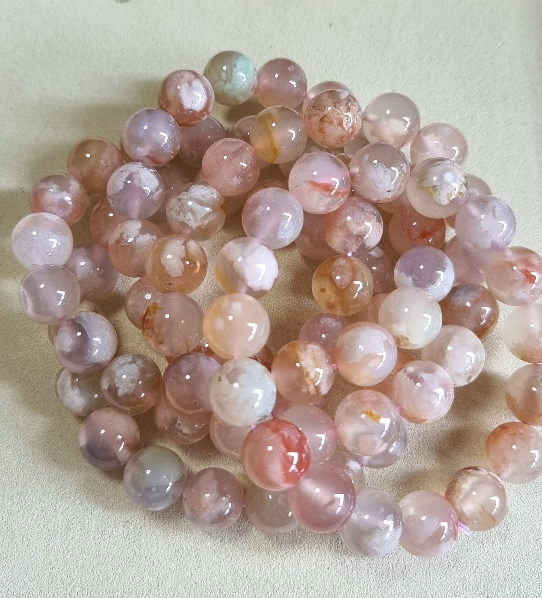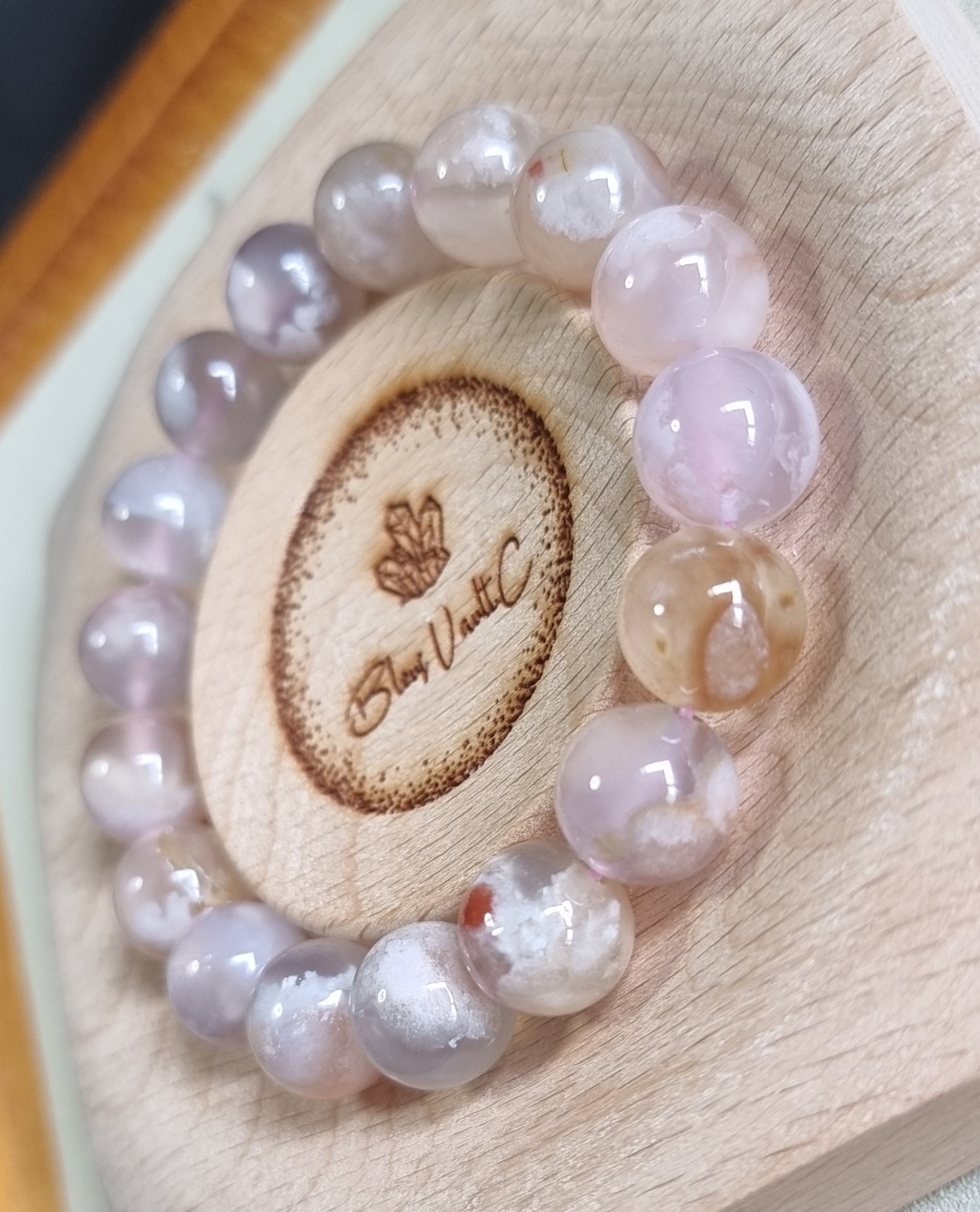 Cherry Blossom Agate has the effects of both agate and rose quartz. Agate has strong positive energy and has the functions of balance, stability and protection. On the other hand, it can calm nervousness and help improve popularity and marriage luck. It can too promote blood circulation and metabolism, relieve discomfort caused by menstrual period, and regulate female hormones. It has the effect of beautifying and improving complexion.