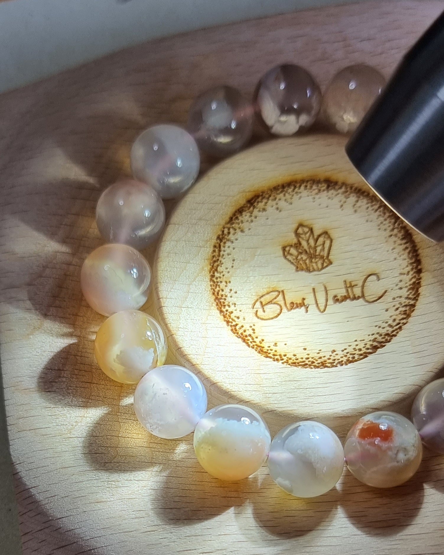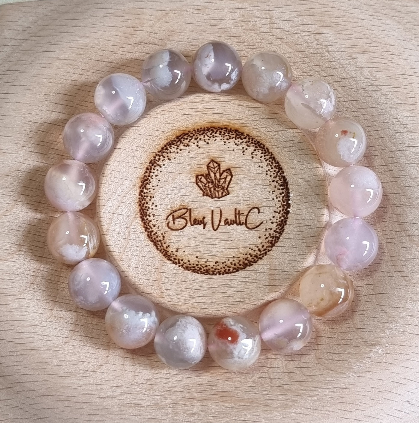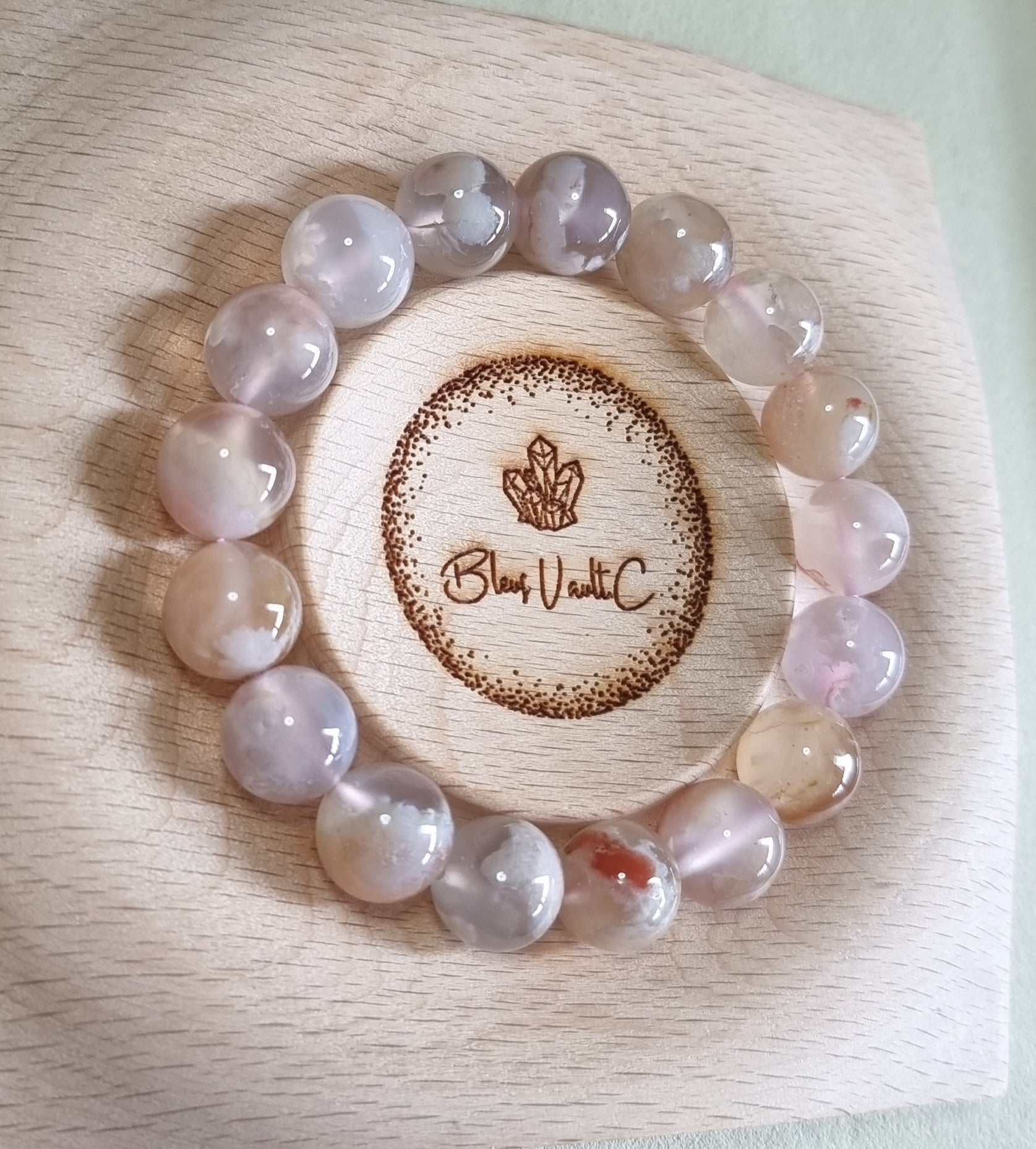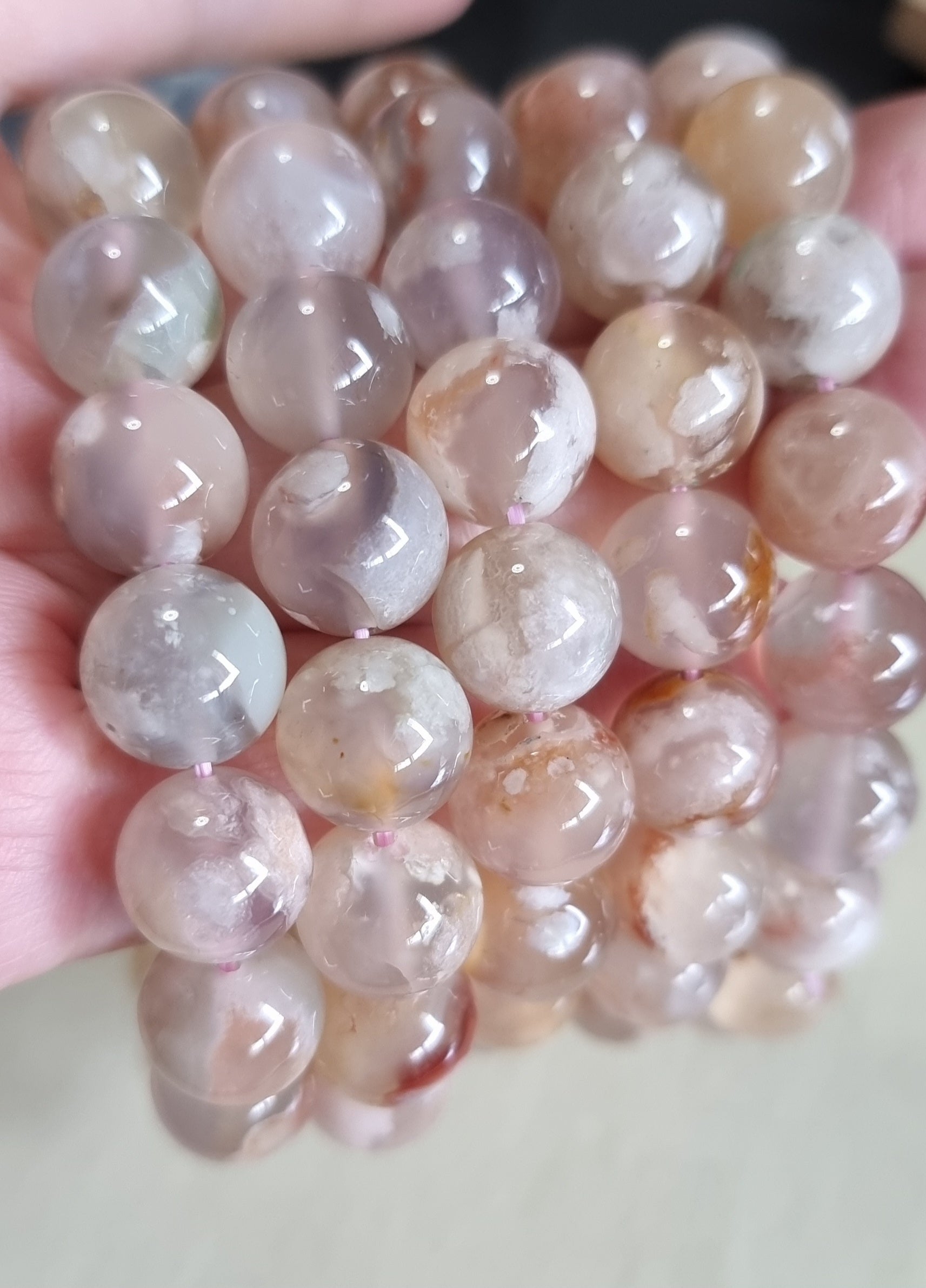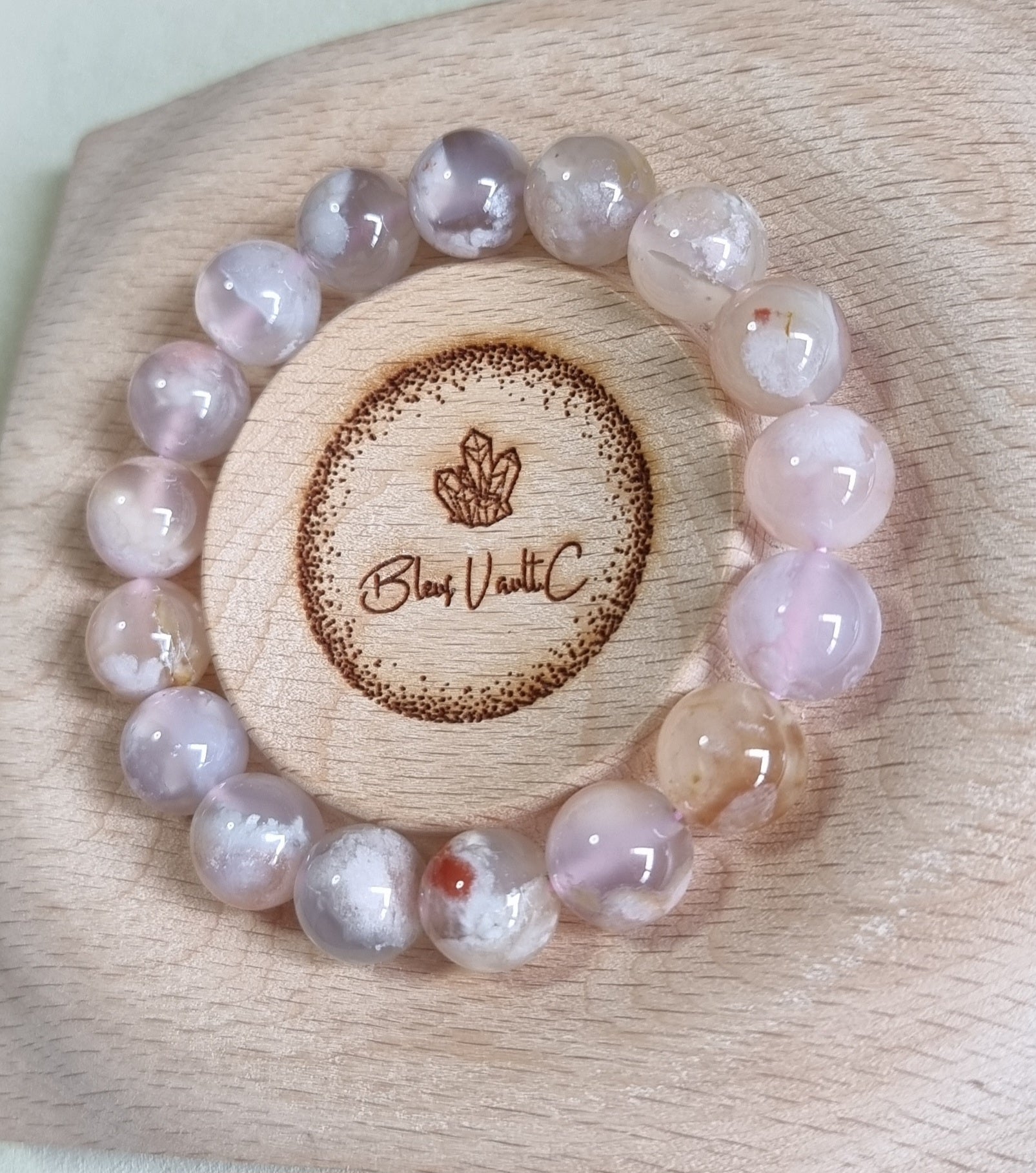 Cherry Blossom Agate has the effects of both agate and rose quartz. Agate has strong positive energy and has the functions of balance, stability and protection. On the other hand, it can calm nervousness and help improve popularity and marriage luck. It can too promote blood circulation and metabolism, relieve discomfort caused by menstrual period, and regulate female hormones. It has the effect of beautifying and improving complexion.